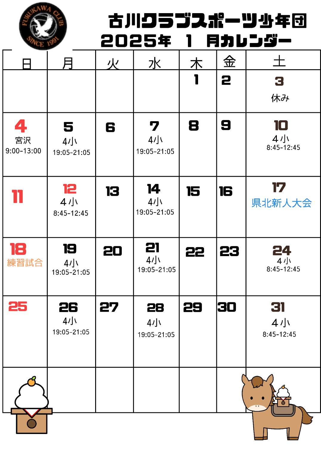 1月予定表 投稿日 2025年12月28日 更新日 2025年12月29日 著者 古川クラブ カテゴリー News 2025年もあと僅かとなりました。 来年は午年🎠何事も「うまくいく」1年となりますように・・・。 ※4小→古川第四小学校体育館 ※宮沢→宮沢公民館 訂正です 誤:2025年 正:2026年 申し訳ありません。 この記事を書いた人 古川クラブ 記事一覧